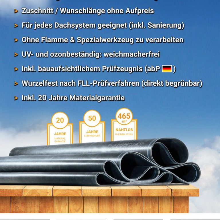 EPDM Dachbahn aus einem Stück ist eine innovative und effiziente Lösung für die Abdichtung von Flachdächern. Diese elastische Dachbahn aus Ethylen-Propyl-Dieen-Monomer bietet hervorragende Witterungsbeständigkeit und eine lange Lebensdauer. Durch die nahtlose Verlegung in großen Bahnen können potenzielle Schwachstellen minimiert werden, was die Dichtheit des Dachs erhöht und Wartungskosten reduziert. Zudem ist EPDM umweltfreundlich und recycelbar, wodurch es eine nachhaltige Wahl für moderne Bauprojekte darstellt. Die Anwendung von EPDM Dachbahnen sorgt nicht nur für Schutz vor Wasser, sondern auch für eine optimale Dachisolierung.
